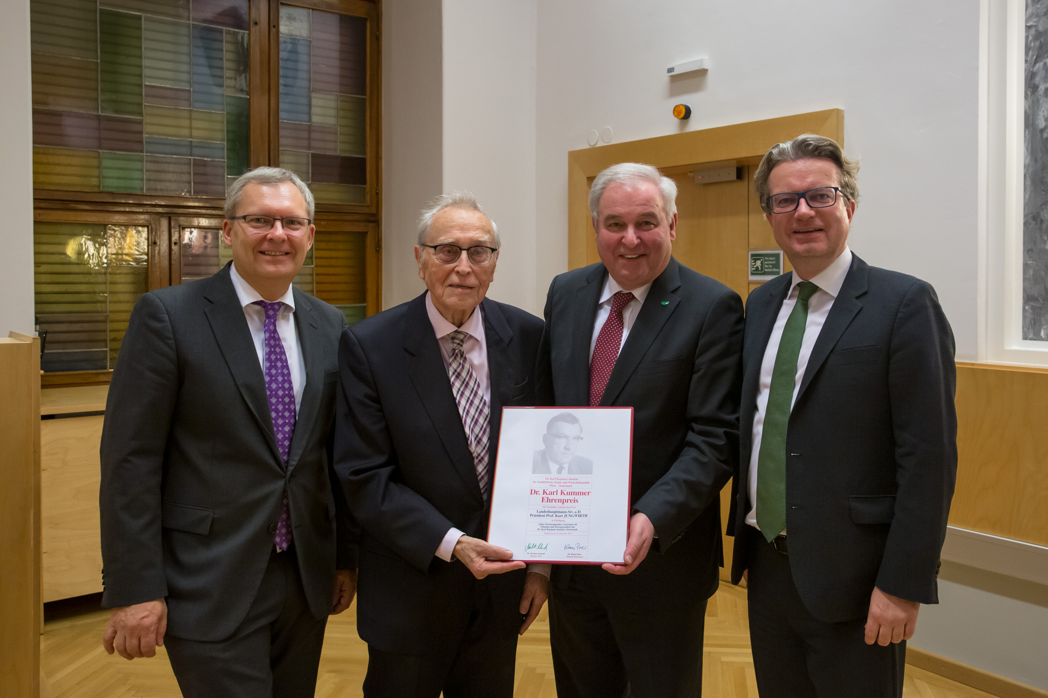 Als besonderer Höhepunkt des Adventgespräches wurde der Dr.-Karl-Kummer-Ehrenpreis an Landeshauptmann-Stv. a.D. Präsident Prof. Kurt Jungwirth verliehen (Gründungsobmann des Instituts 1979-2005, seither Ehrenpräsident). Die Laudatio bei der Preisverleihung hielt Landesrat Mag. Christopher Drexler.