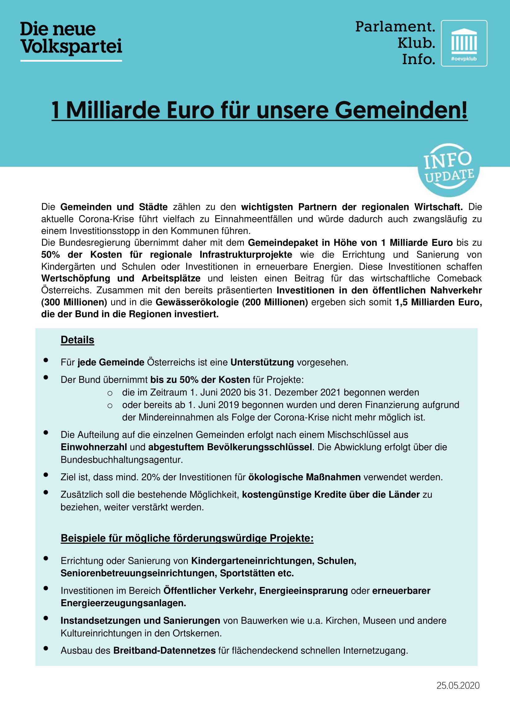 Die Mittel des Bundes sind für Investitionen vorgesehen, die im Zeitraum von 1. Juni 2020 bis 31. Dezember 2021 begonnen werden oder bereits ab 1. Juni 2019 starteten und die Finanzierung aufgrund der Mindereinnahmen als Folge der Corona-Krise nicht mehr möglich ist. Mit bis zu 50% werden Projekte wie etwa die Errichtung von Kindergärten, Maßnahmen zu Verbesserung des öffentlichen Verkehrs oder der Breitbandausbau gefördert.