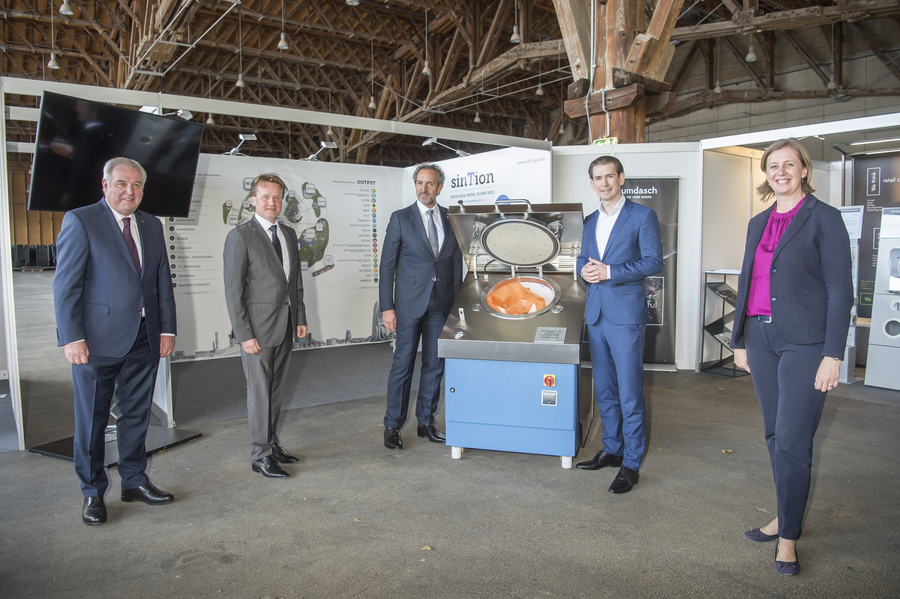Johann Christof (M.) präsentierte Landeshauptmann Hermann Schützenhöfer, Georg Knill (IV Steiermark), Bundeskanzler Sebastian Kurz und Landesrätin Barbara Eibinger-Miedl ein Gerät zur medizinischen Abfallsbehandlung und Desinfektion (Foto Fischer).