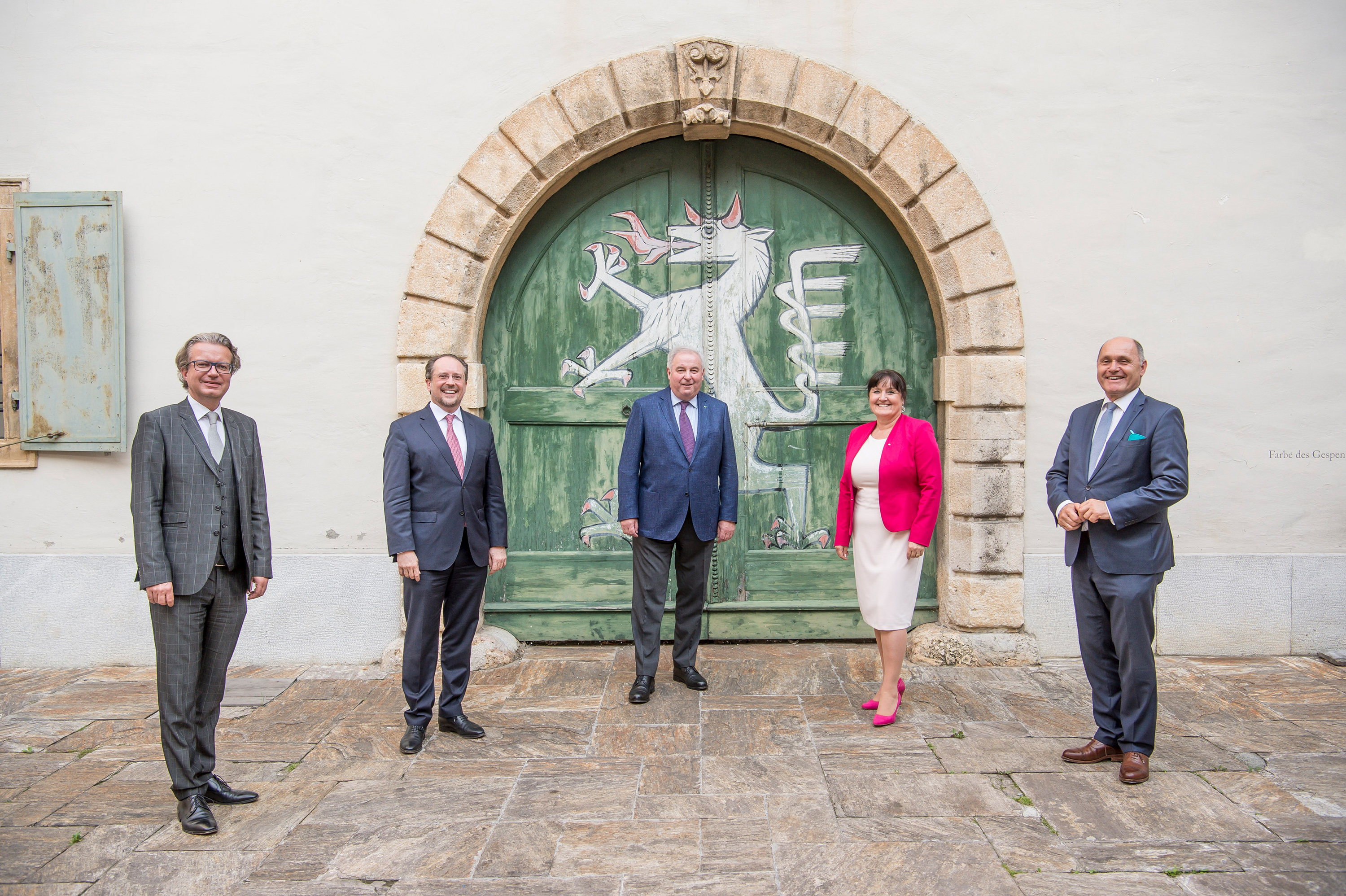 Trafen sich zum Arbeitsgespräch in Graz: LR Christopher Drexler, Außenminister Alexander Schallenberg, LH Hermann Schützenhöfer, LT-Präs. Manuela Khom und NRPräs. Wolfgang Sobotka © Land Steiermark/FotoFischer