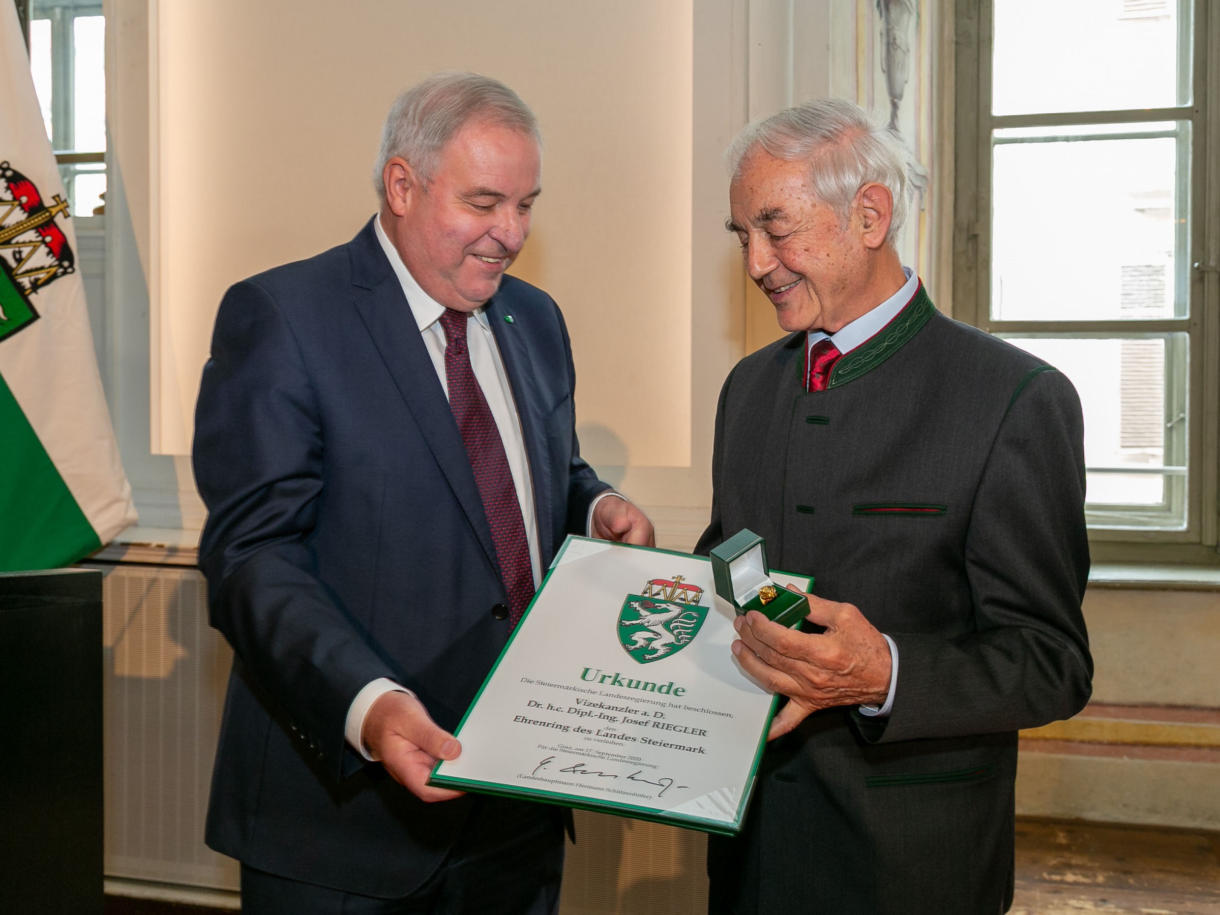 In der Aula der Alten Universität in Graz überreichte Landeshauptmann Hermann Schützenhöfer heute Vormittag (17. September 2020) dem ehemaligen Vizekanzler Josef Riegler den Ehrenring des Landes Steiermark. An der feierlichen Überreichung nahmen unter anderen die ehemaligen Landeshauptleute Waltraud Klasnic und Franz Voves, die früheren Bundesminister Ruth Feldgrill-Zankel und Gerald Klug, der Grazer Altbürgermeister Alfred Stingl, Diözesanbischof Wilhelm Krautwaschl sowie Familienmitglieder und Wegbegleiter des Geehrten teil.