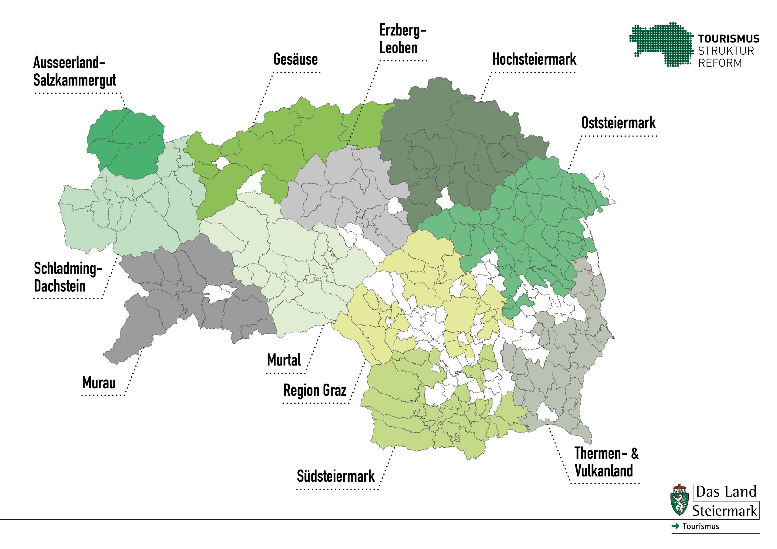 Die Zusammensetzung der Erlebnisregionen ist in der beiliegenden Grafik ersichtlich (weiß gefärbte Gemeinden sind keine Tourismus-Gemeinden und nicht Teil der neuen Tourismusverbände).