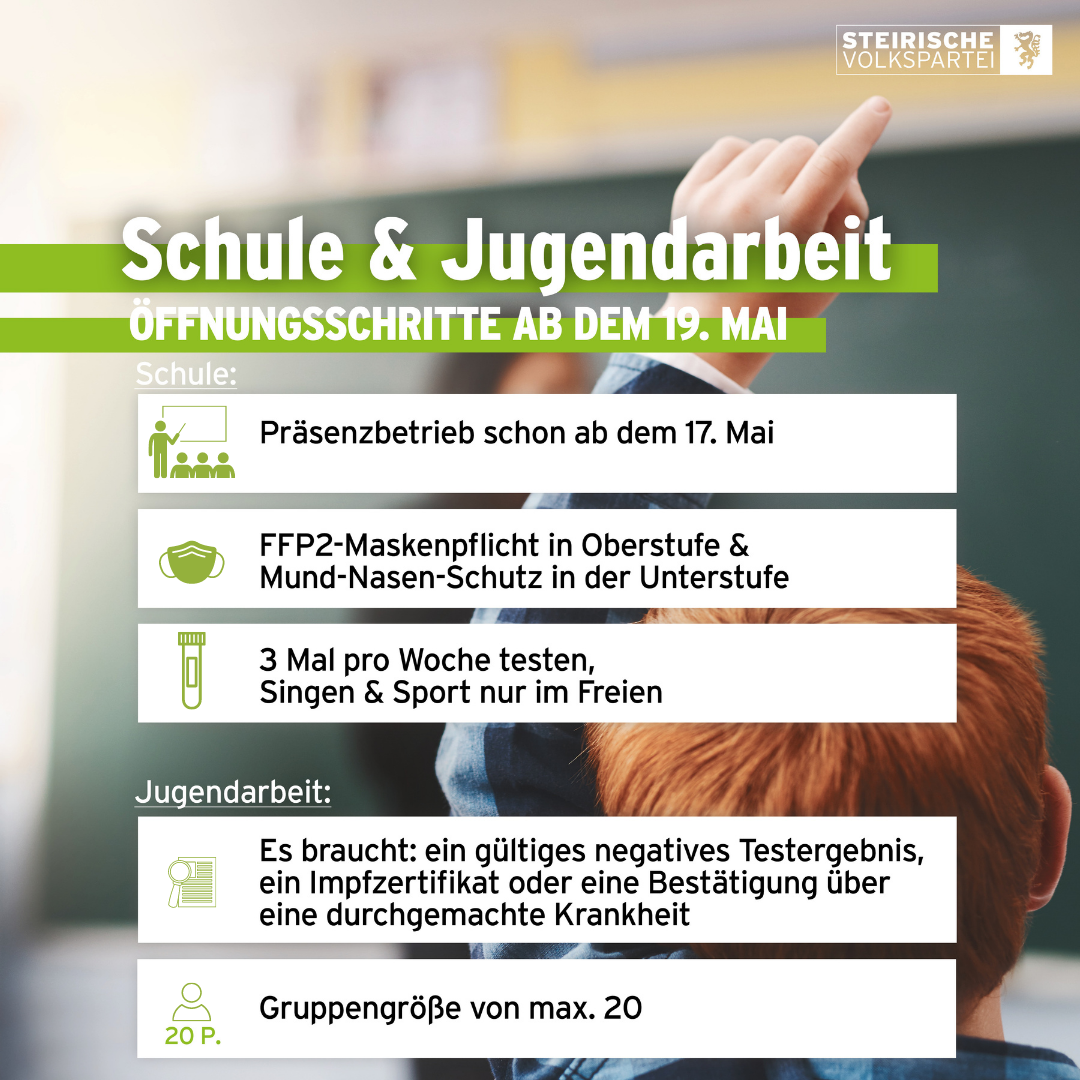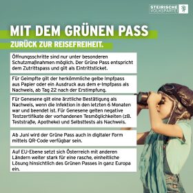 - Ab 19. Mai gelten bestehende Nachweise, ob man getestet, geimpft oder genesen ist (Testergebnis, Impfpass, Absonderungsbescheid etc.)