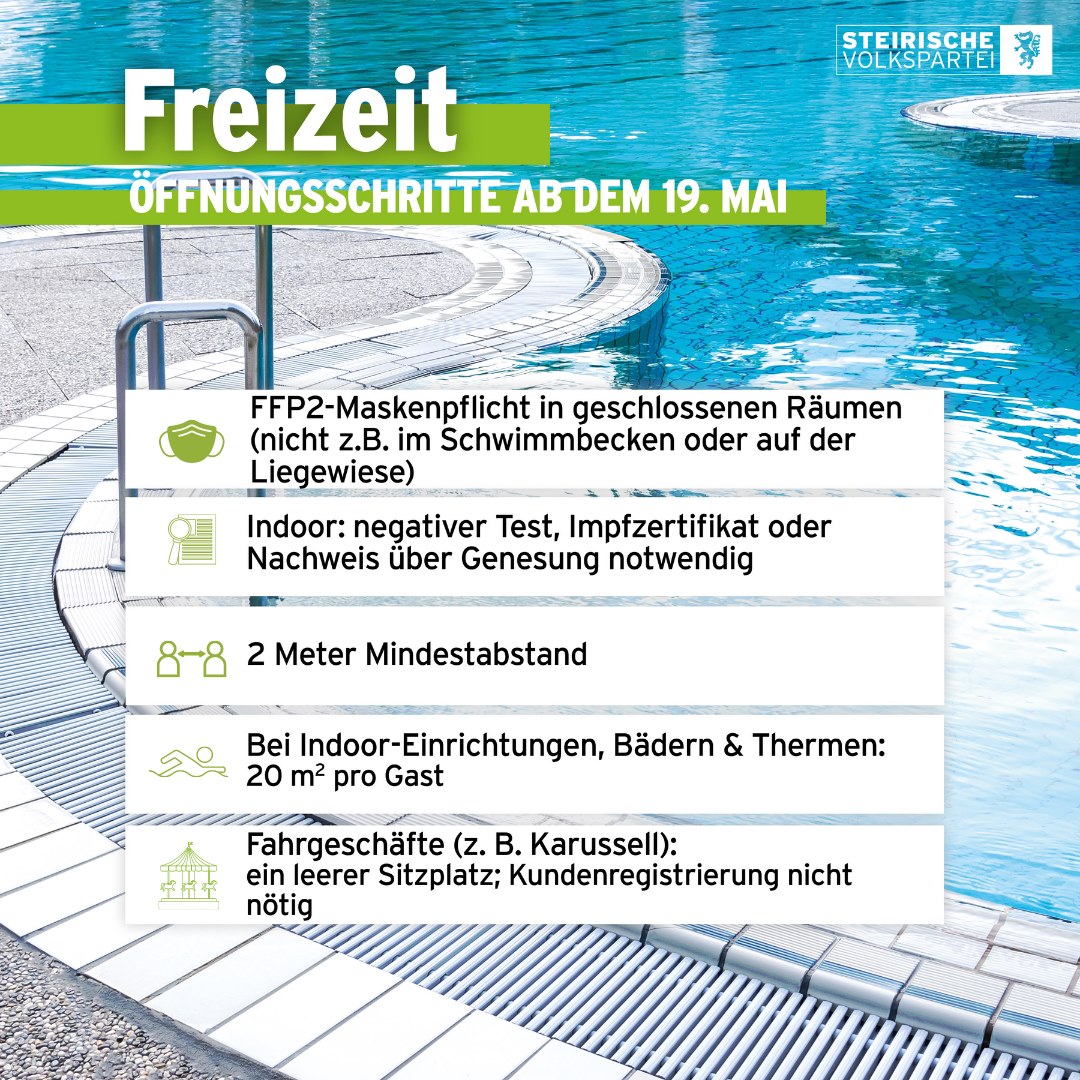 Nachweise über Test, Impfung oder Genesung werden zur „Eintrittskarte“. Bei Indoor-Einrichtungen, in Bädern oder Thermen müssen mindestens 20m² pro Gast zur Verfügung stehen. Außerdem sind zwei Meter Mindestabstand einzuhalten, sofern das nicht möglich ist, müssen entsprechende Schutzvorrichtungen (z.B. Plexiglas) vorhanden sein. In geschlossenen Räumen gilt weiterhin die FFP2-Maskenpflicht, nicht jedoch z.B. im Schwimmbecken oder auf der Liegewiese im Schwimmbad. Bei Fahrgeschäften wie dem Karussell ist ein leerer Sitzplatz zwischen den Gästen einzuhalten, eine Registrierung ist nicht nötig.