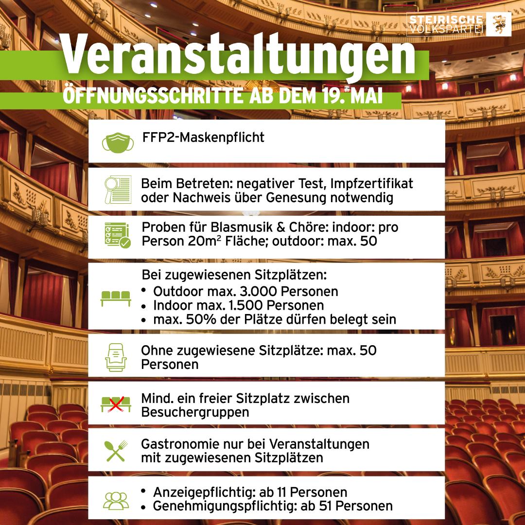 Lange Zeit war es nicht möglich, Veranstaltungen, Messen, Kongresse oder auch nur ein Kino zu besuchen. Auch das wird wieder möglich sein, jedoch unter den folgenden Voraussetzungen: Beim Betreten ist ein negativer Test, ein Impfzertifikat oder ein Nachweis über Genesung notwendig. Bei Veranstaltungen mit zugewiesenen Sitzplätzen sind indoor maximal 1.500 Personen, outdoor maximal 3.000 Personen zugelassen, wobei die Maximalauslastung von 50% nicht überschritten werden darf. Ohne zugewiesene Sitzplätze sind indoor wie auch outdoor nur maximal 50 Personen erlaubt. Zudem bestehen FFP2-Maskenpflicht sowie ein verpflichtend einzuhaltender Mindestabstand von zwei Metern und ein freier Sitzplatz zwischen Besuchergruppen. Bei Proben für Blasmusik und Chöre gilt: Indoor pro Person 20m² Fläche, outdoor maximal 50. Gastronomie ist nur bei zugewiesenen Sitzplätzen erlaubt. Veranstaltungen sind ab 11 Personen anzeigepflichtig, ab 51 Personen sind sie genehmigungspflichtig.