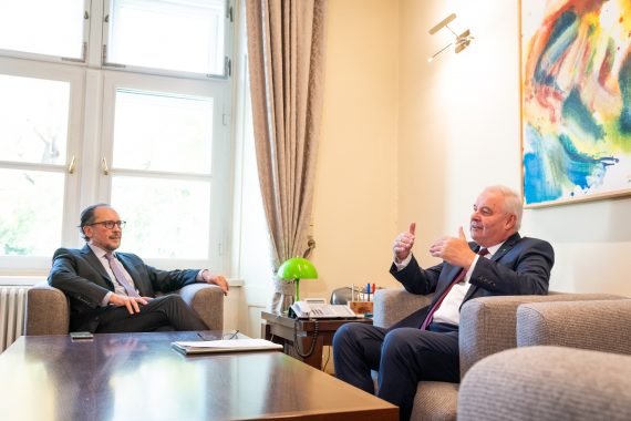 Der erste offizielle Bundesländerbesuch als Bundeskanzler führte Alexander Schallenberg in die Steiermark. Erstmals seit seiner Ernennung und Angelobung war er am 23. Oktober zu Gast bei Landeshauptmann Hermann Schützenhöfer in der Grazer Burg. Themen des Meinungsaustausches waren vor allem die innenpolitischen Herausforderungen mit speziellem Fokus auf die sich wieder zuspitzende Corona-Lage. Landeshauptmann Schützenhöfer betont: „Es hat mich sehr gefreut, Alexander Schallenberg auch im persönlichen Gespräch meine Wertschätzung und gute Wünsche für seine Aufgabe aussprechen zu können. Wir alle haben aber keine Zeit, nach den Turbulenzen der vergangenen Wochen innezuhalten. Die Bundesregierung ist mit Blick auf die steigenden Corona-Infektionszahlen ganz massiv gefordert. Es gilt durch gemeinsame Anstrengungen daran zu arbeiten, dass die nächsten Monate die Corona-Situation beherrschbar bleibt“, sagt Schützenhöfer. „Ich bin sehr optimistisch, dass Alexander Schallenberg auf Grund seiner langjährigen Erfahrung und seiner professionellen Arbeitshaltung die Republik in eine gute Zukunft führen wird und wir gemeinsam die Pandemie erfolgreich bekämpfen können“, so der steirische Landeshauptmann.