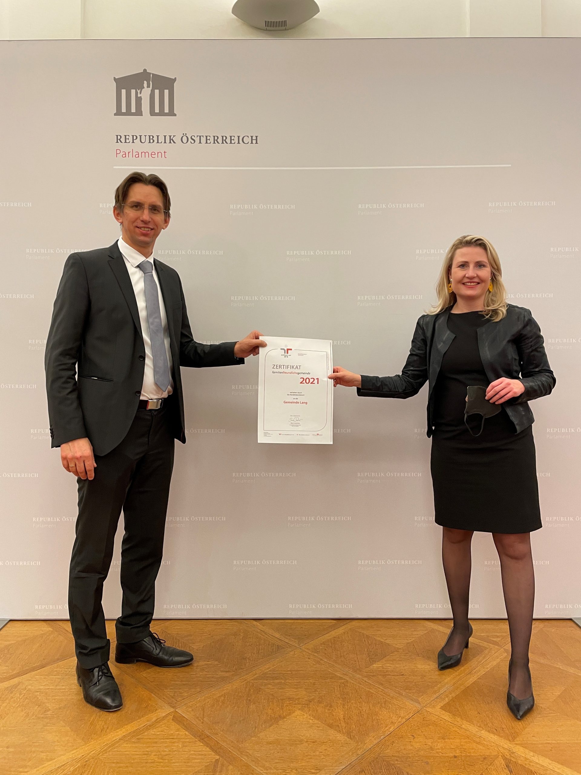 Abg.z.NR. Bgm. Joachim Schnabel, Gem. Lang, übernahm stolz die Auszeichnung von BMin Susanne Raab.