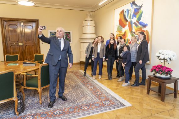 LH Hermann Schützenhöfer mit Laura Sachslehner und seinen Mitarbeiterinnen im Büro (Foto Fischer)