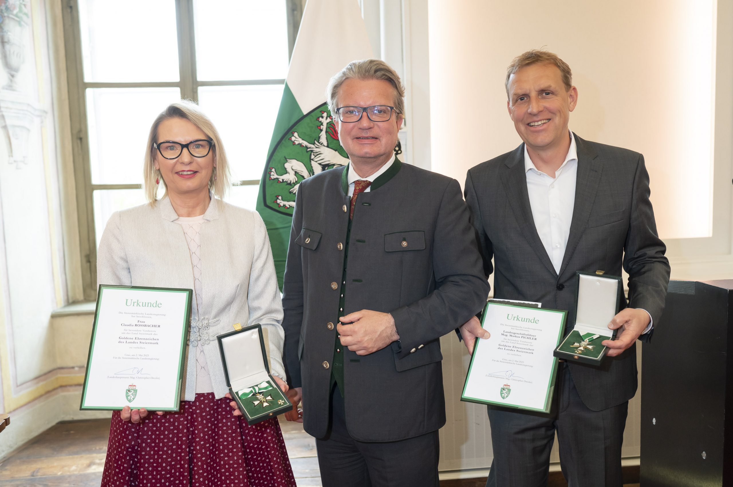 Auch der erfolgreichen steirischen Krimiautorin Claudia Rossbacher wurde das Goldene Ehrenzeichen verliehen. „Steirerblut, Steirerherz, Steirerland, Steirerwahn und noch einige weitere Bände – wer kennt sie nicht, die beliebten Kriminalromane der Schriftstellerin Claudia Rossbacher. Sie zählt zu den erfolgreichsten österreichischen Autorinnen und ist durch die sorgfältig geschilderten Schauplätze zu einer wesentlichen Botschafterin der Steiermark geworden. Zu diesen großartigen Erfolgen sowie zur Verleihung des Goldenen Ehrenzeichens gratuliere ich sehr herzlich″, betonte Landeshauptmann Drexler.