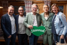 STG-Geschäftsführer Michael Feiertag, Klaus Leutgeb (Leutgeb Entertainment), LH Christopher Drexler, Robbie Williams, LR Eibinger-Miedl © Land Steiermark