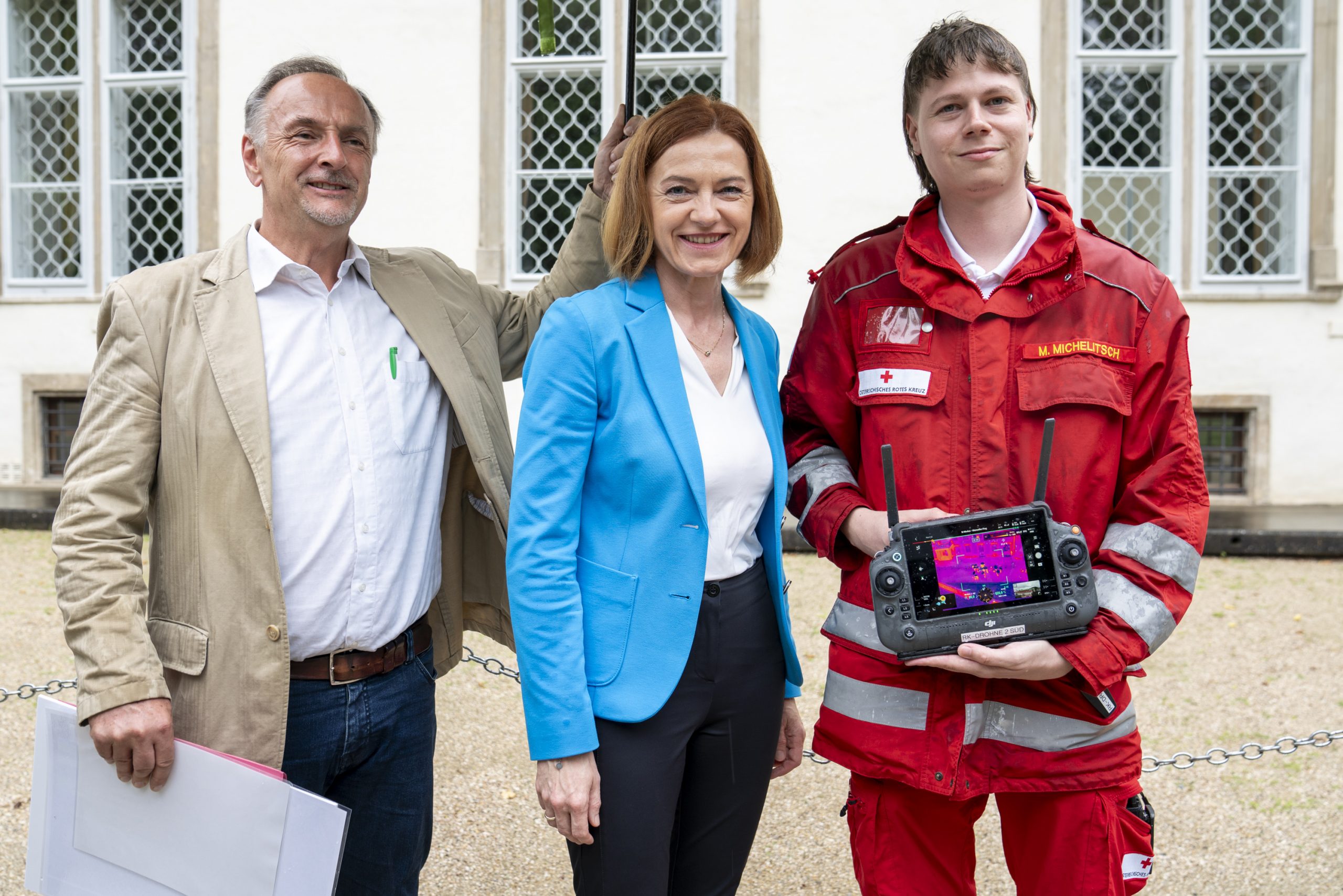 ASP-Übung in Graz: Landesveterinärdirektor Peter Eckhardt und LR Simone Schmiedtbauer mit einem Mitarbeiter des Rot-Kreuz-Drohnenteams.