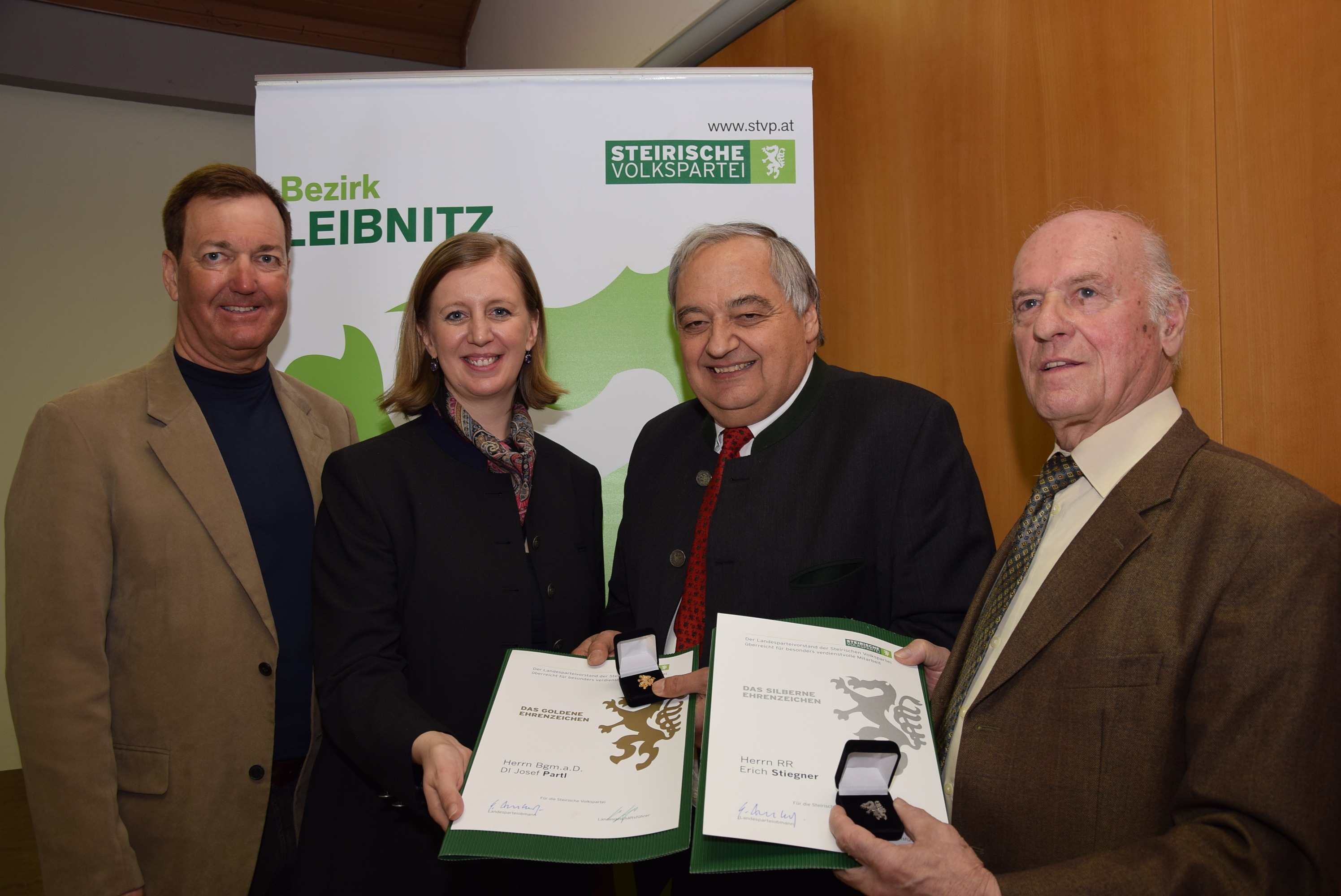 Neu in der ÖVP-Organisation in Straß ist die neue Obfrau des Seniorenbundes, Johanna Rode, und mit der engagierten jungen Julia Ritter erhofft sich Höflechner den Start zu einer Jungen-ÖVP-Ortsgruppe. – Für ihre Verdienste in der ÖVP und Öffentlichkeit erhielten der vormalige Vizebürgermeister von Spielfeld, Erich Stiegner, das silberne und der vormalige Bürgermeister von Vogau, Josef Partl, das goldene ÖVP-Ehrenzeichen der Landesorganisation von Eibinger-Miedl überreicht. Sichtlich berührt dankten sie für die Ehrung, und Partl erinnerte, dass er schon in jungen Jahren der ÖVP ob ihres „christlich-sozialen Gedankengutes“ beigetreten sei. An das, so merkte er kritisch an, „sollte sich die heutige ÖVP wieder mehr erinnern“.