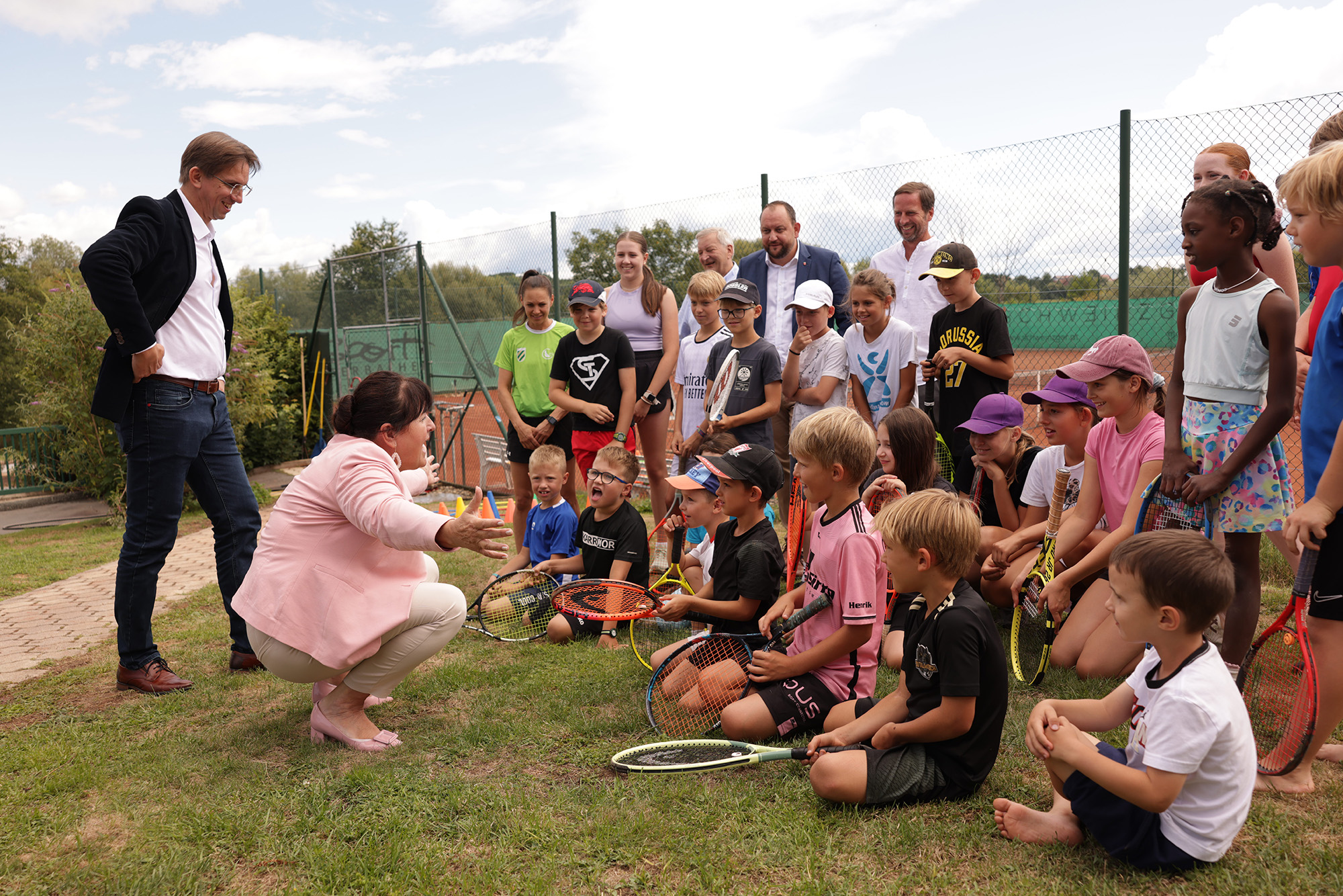 Den ersten Halt legte die Landeshauptmann-Stellvertreterin nach kurzem Austausch mit Bürgermeistern aus der Hengist-Region beim Kinder-Tenniscamp von Wilfried Schweinzger in Lang ein. Der Gastwirt schafft mit Unterstützung der Sportgemeinschaft Lang und der Gemeinde von Bürgermeister Joachim Schnabel einen zweiwöchigen Kurs für insgesamt rund 50 Kinder aus der Region. „Kinder sind unsere Zukunft. Dank dieser Initiative und dem umfassenden Sportangebot beim Tenniscamp wird ihnen eine sportliche Abwechslung in den Ferien geboten und gleichzeitig ihre Selbstständigkeit gefördert“, freut sich LH-Stv. Manuela Khom.