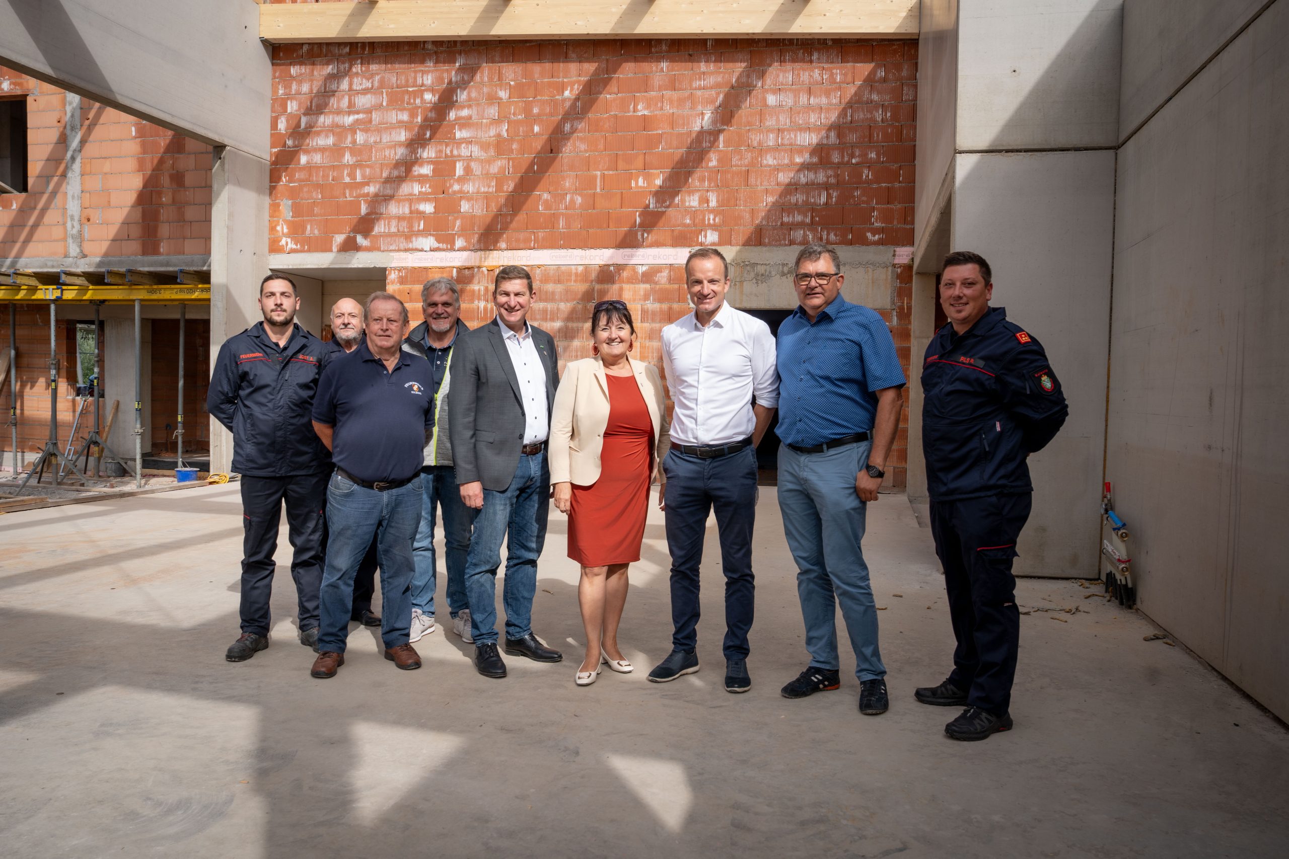 Andreas Kühberger, Manuela Khom, Porr Gruppenleiter Stefan Eisenberger, Bgm. Mario Angerer und HBI Philip Pils mit Mitgliedern der FF Kalwang und Arbeitern bei der Baustellenbesichtigung des neuen Rüsthauses der FF Kalwang (c) STVP