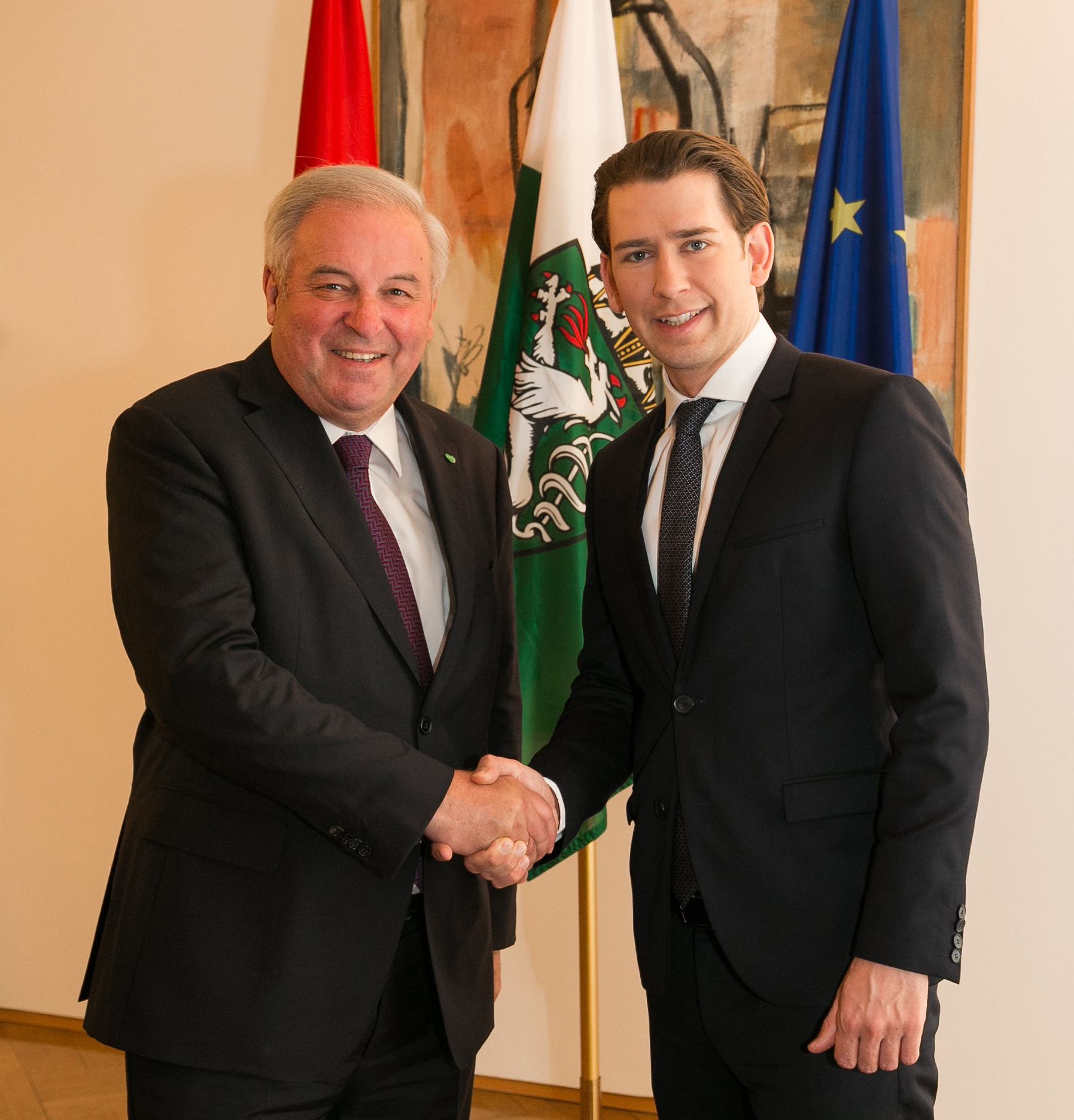 Landeshauptmann Hermann Schützenhöfer empfing Bundeskanzler Sebastian Kurz gestern Abend (26.4.2018) zu einem Gespräch in der Grazer Burg. Für Kurz war es seit seiner Angelobung als Bundeskanzler der erste Besuch im Büro des steirischen Landeshauptmanns. Neben den tagespolitischen Themen war insbesondere die hervorragende Entwicklung der Steiermark Gesprächsthema. Landeshauptmann Hermann Schützenhöfer verwies darauf, dass durch die vertrauensvolle Zusammenarbeit in der Regierung Impulse für das Land gesetzt werden konnten. Kurz betonte beim Zusammentreffen die enge Zusammenarbeit zwischen dem Bund und den Ländern. „Es gibt eine Reihe von Themen, die wir gemeinsam mit den Ländern umsetzen wollen. Hermann Schützenhöfer sehe ich als verlässlichen Partner. Der steirische Reformkurs dient bei unseren Vorhaben als gutes Beispiel“, so der Bundeskanzler.