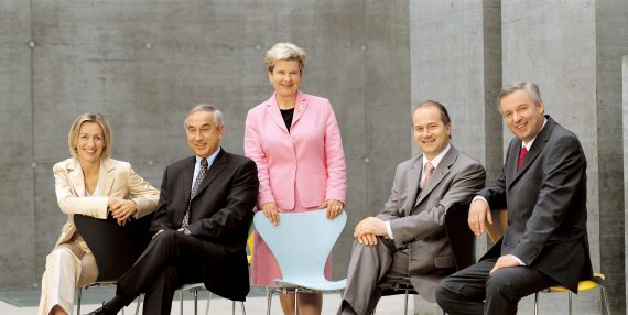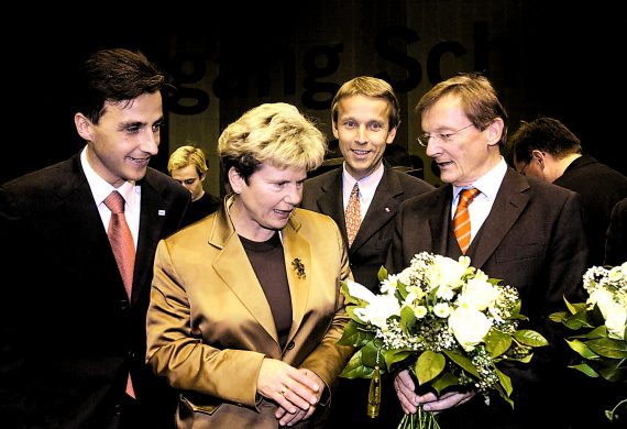 Umbau der Parteispitze 2003/2004. Von links: Edlinger-Ploder, Schöpfer, Seitinger, Schützenhöfer; stehend: Purr, Klasnic, Schnider, Drexler.