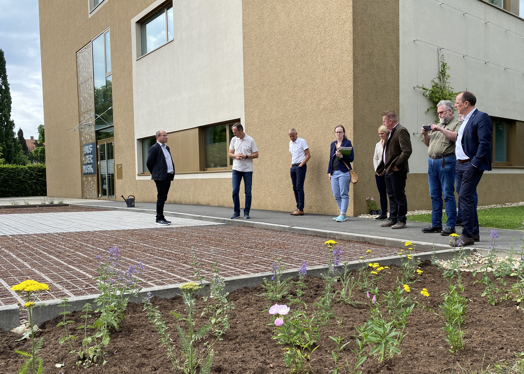 Das „Grüne Haus der Musik“ in Gleisdorf ist ein Beispiel für klimaangepasstes Bauen und ein regionales Demo-Projekt für nachhaltige Architektur. Die Stadtgemeinde, das Stadtmarketing Gleisdorf und die Energieregion Weiz-Gleisdorf haben gemeinsam Maßnahmen ergriffen, um das Gebäude auf mehreren Ebenen zu begrünen und so die Folgen des Klimawandels besser zu bewältigen. Die Maßnahmen umfassen die Entsiegelung des Parkplatzes und die Schaffung von zwei Regengärten, um den Regenwasserabfluss und die -speicherung zu verbessern. Die Dachterrasse und die angrenzenden Bereiche wurden mit Blütengehölzen und Stauden bepflanzt, um die Hitzebelastung zu reduzieren und die Aufenthaltsqualität zu erhöhen. Eine bodengebundene grüne Fassade mit Rankpflanzen beschattet und kühlt die Musikschule. Zusätzlich wurde ein öffentlicher Trinkbrunnen installiert, um im Sommer für Erfrischung zu sorgen. In der Nähe des Hauses der Musik befindet sich außerdem die Straße der Energiewende, ein interaktiver Lehrpfad zu den Themen Energie und Klima, der Interessierten bei Exkursionen, Schulungen und Führungen gemeinsam mit dem „Grünen Haus der Musik“ gezeigt wird. Im Rahmen des KLAR!-Programms wurde das „Grüne Haus der Musik“ vom Klima- und Energiefonds mit 40.000 Euro gefördert.