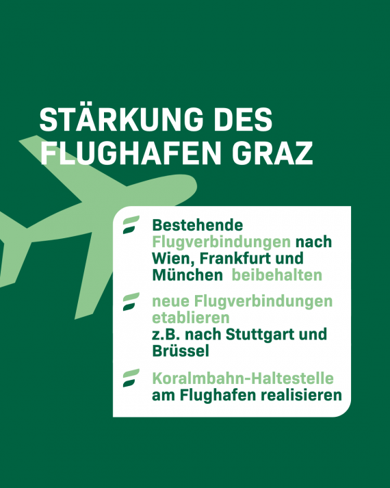 Der Flughafen Graz ist für den Wirtschafts- und Tourismusstandort Südösterreich von grundlegender Bedeutung. Deswegen wollen wir den Flughafen Graz weiterhin als Tor zur Welt stärken!