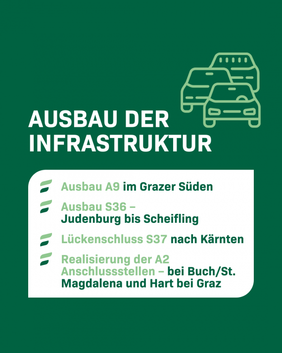 Die Steiermark braucht zukunftstaugliche Verkehrswege! Deswegen ist aus unserer Sicht klar: Wir müssen den Ausbau der A9 im Süden von Graz und etwa den Ausbau der S36 von Judenburg nach St. Georgen ob Judenburg und weiter bis Scheifling sowie den Lückenschluss der S37 nach Kärnten voranbringen!