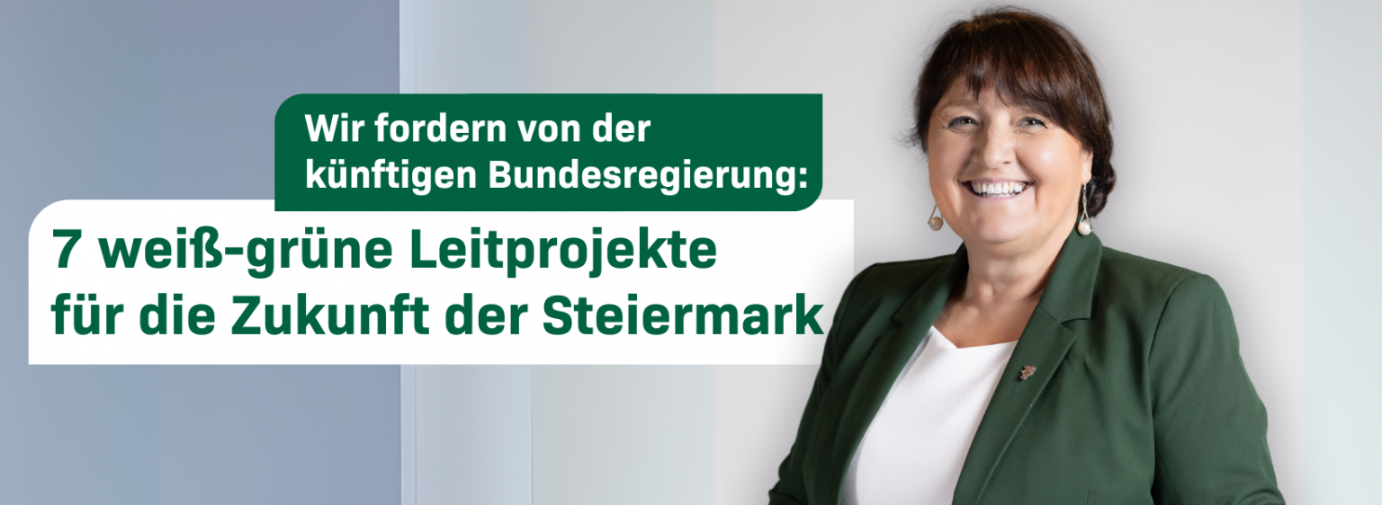 Doch nicht alles kann auf Landesebene entschieden werden. Darum bekennen wir uns zu 7 weiß-grünen Leitprojekten, deren Realisierung in den Zuständigkeitsbereich des Bundes fällt, für die Steiermark jedoch von größter Bedeutung ist. Bei diesen 7 Leitprojekten handelt es sich um langjährige Forderungen an den Bund.